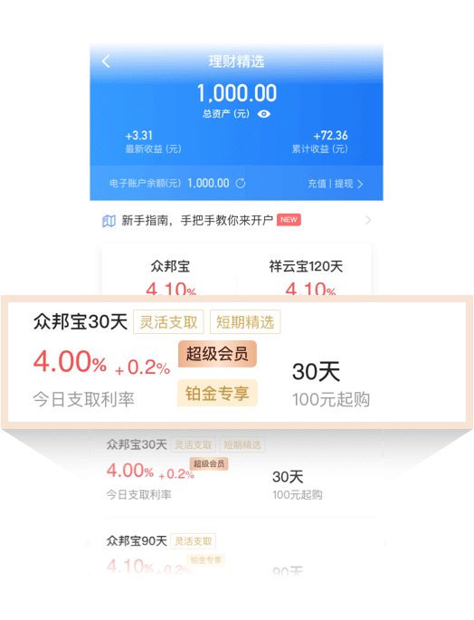 2理财首页-选择有“超级会员”、“铂金/钻石专享”标签的产品