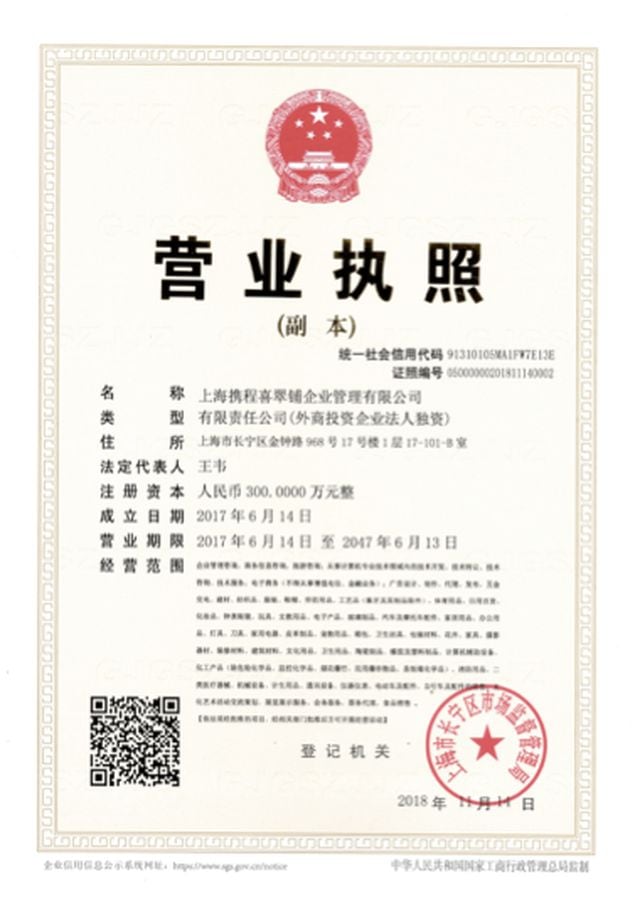 上海携程喜翠铺企业管理有限公司营业执照
