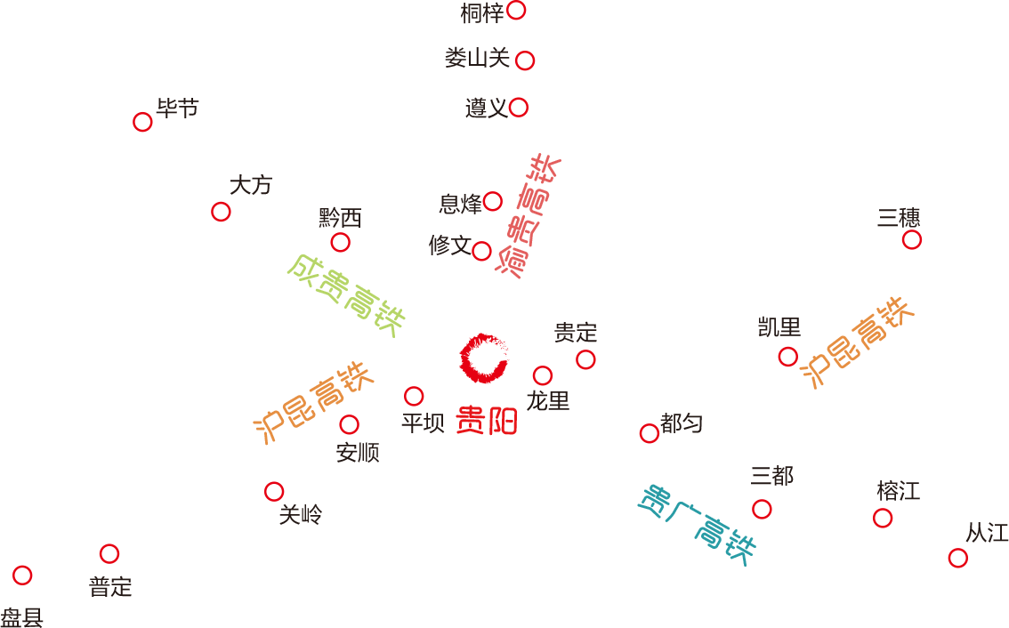 沪昆铁路贵州段是世界上跨度最大,地形起伏大、地质结构最复杂的铁路。沪昆铁路客运专线贵州段全长559.5公里,设计时速250公里。东起铜仁市玉屏县,经凯里、贵阳、安顺,从盘县进入云南,与贵广、渝黔、成贵等铁路相接。贵州段设有11个站点:铜仁南站、三穗站、凯里南站、贵定北站、贵阳东站、贵阳北站、平坝南站、安顺西站、关岭站、普安县站、盘州站。